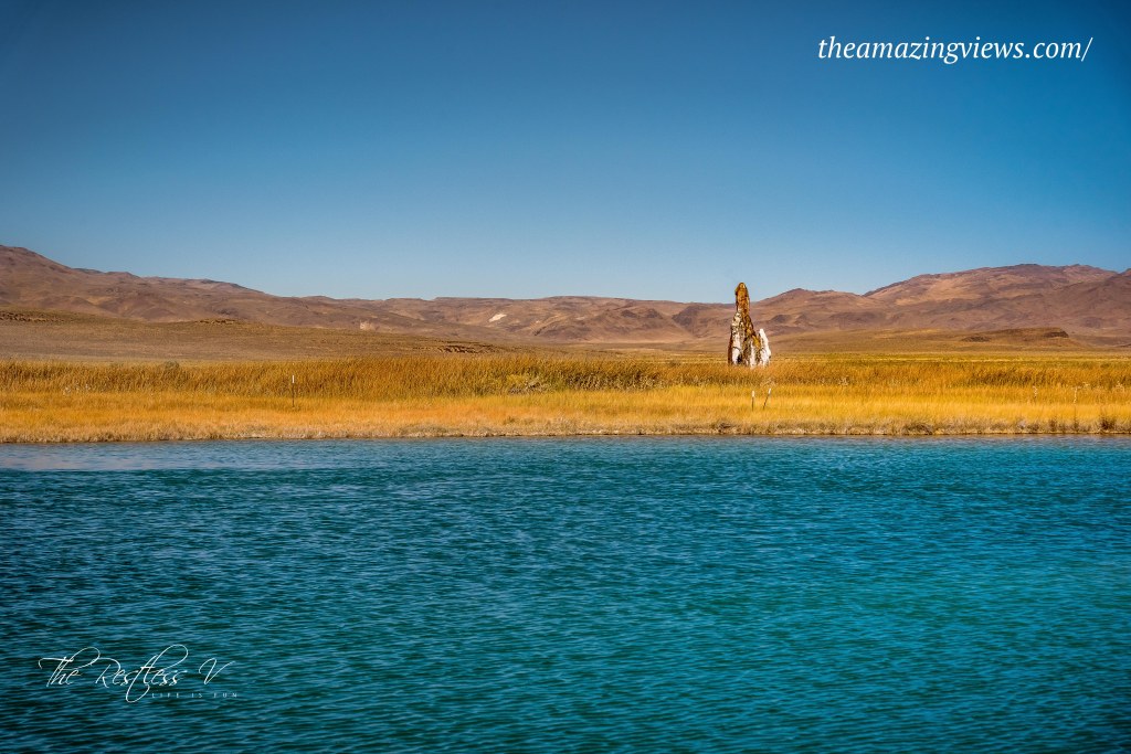 这个Walking Tour不太需要走路,是个老少皆宜的活动。首先,去Gerlach的Friends of Black Rock-High Rock的门店去check-in。然后跟着导游,开车20分钟,到达Fly Geyser所在地。之后导游会带大家环游这个农场一圈,介绍介绍这里的历史啊,地貌啊。主要的景点有两个,第一个是个温泉湖,碧蓝的湖水,水温非常舒服。可惜这里不让游客泡温泉。如果想在这里泡温泉,就得在这里当志愿者。只有工作人员和志愿者能在这里泡汤。在这里还能远远地看到1916年的那个荒废的间歇泉。