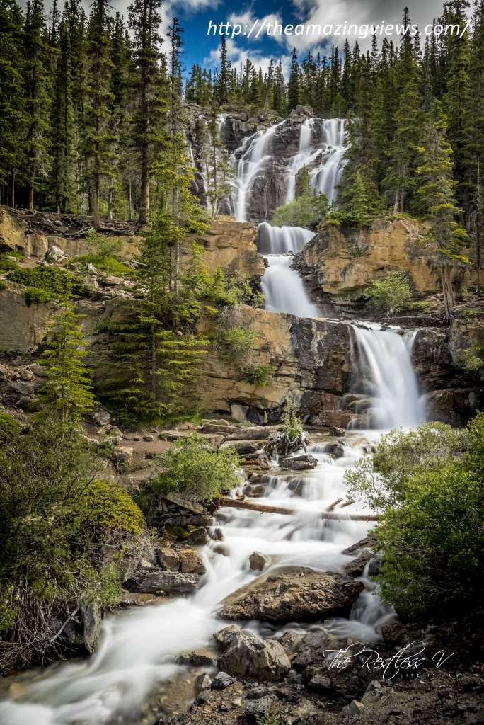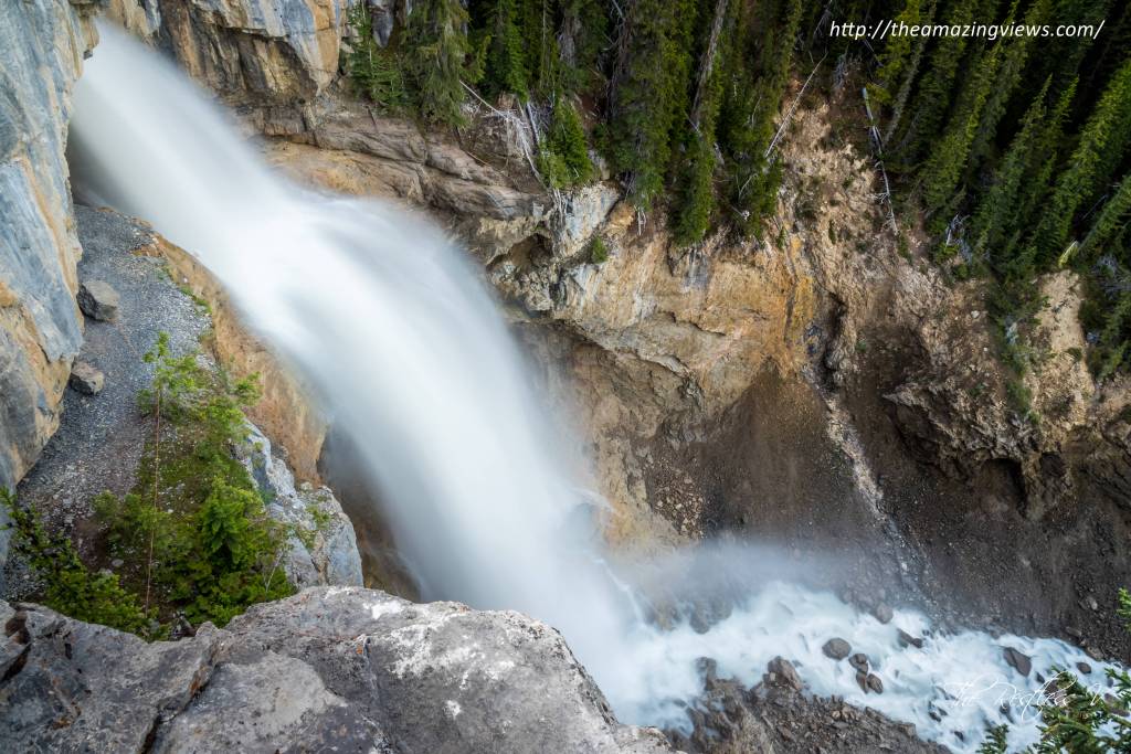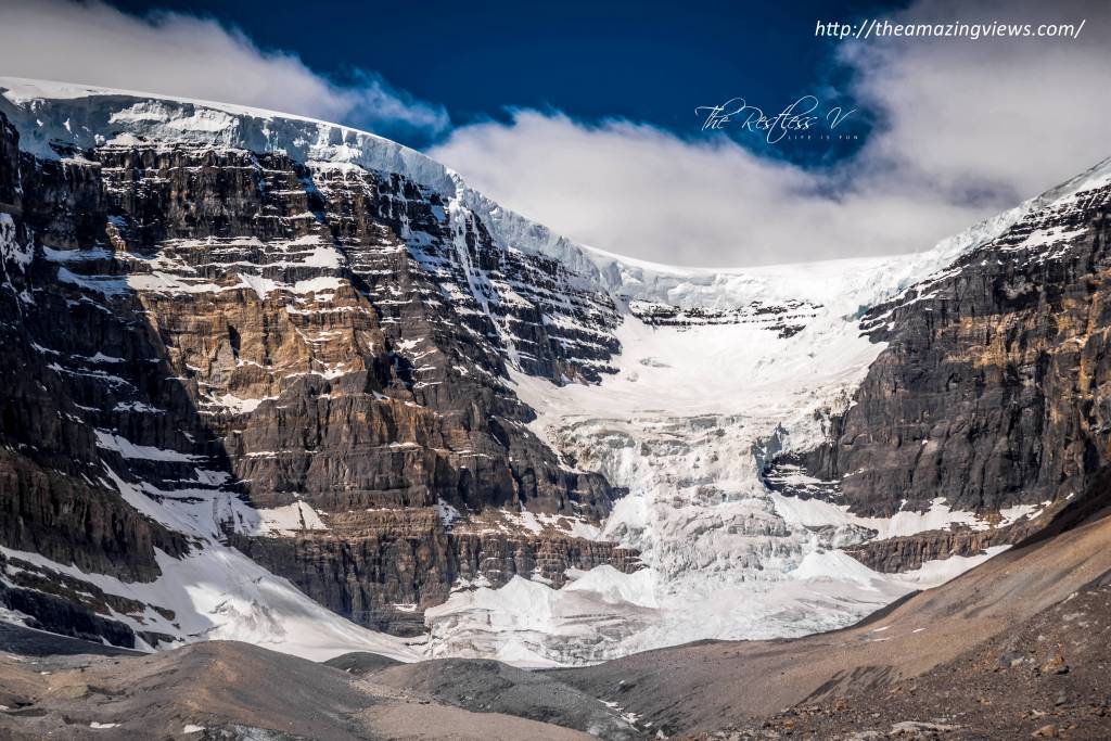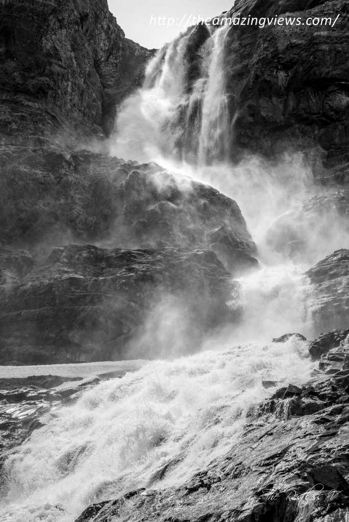 其实 Canadian Rockies 的湖都是冰川融水,把 Bow Lake 拿出来说,主要是因为这里的冰川瀑布。这是一条 5.4 miles 的徒步路线,前一程沿着 Bow Lake ,基本没有坡度;后一程全程爬山,要爬 600 feet 。虽然有些难度,但是 beginner 爬也是没有问题的。走到瀑布旁边,看着瀑布飞流直下,非常的壮观。